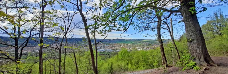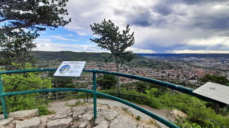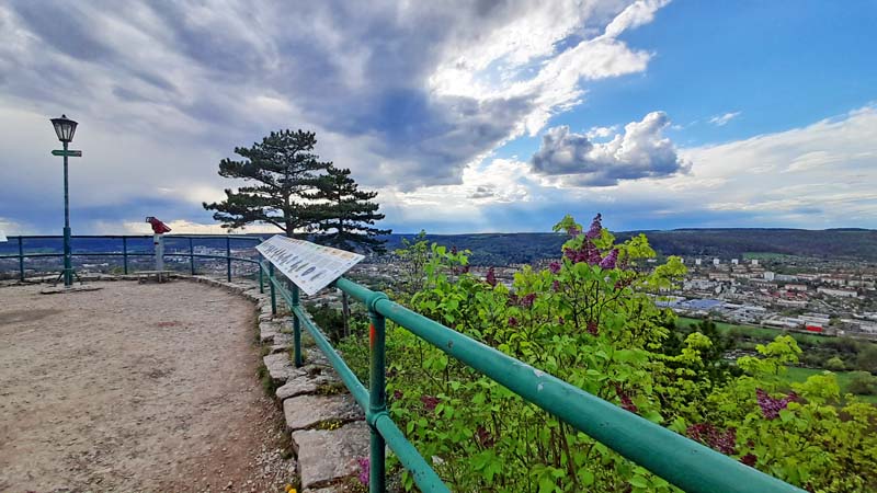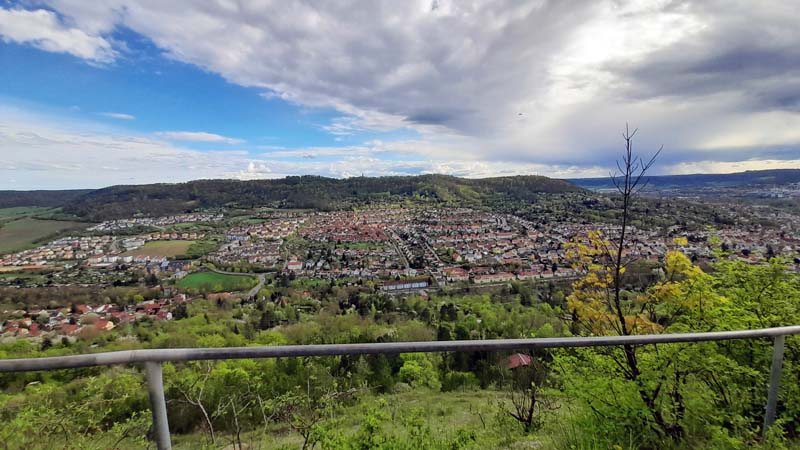 Oben auf dem Berg endet der Lehrpfad an einer Aussichtsplattform mit herrlicher Aussicht über die Stadt Jena. Wer noch ein paar Meter weiter den Hang hinaufgeht, trifft auf den Berggasthof Jenzig.