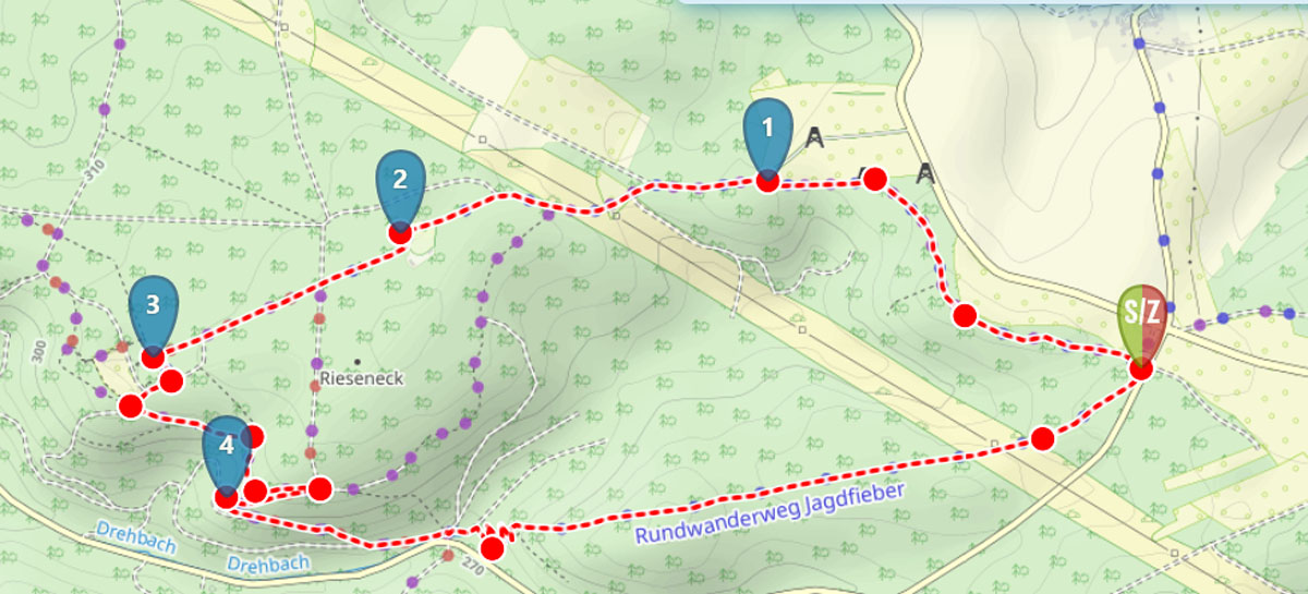 Ein wirklich wunderschöner Schauplatz der herzoglichen Jagdgeschichte Thüringens ist die Jagdanlage Rieseneck unweit von Hummelshain im Saale-Holzland-Kreis. Das Gebiet war schon immer sehr wildreich, und so nutzte man im 16 Jahrhundert zunächst einfache Mittel wie Lecksteine, um dies anzulocken. In den folgenden Jahrhunderten baute man die Anlage immer weiter aus. Drei Laufgräben und zwei unterirdische Gänge, die in kleinen überdachten Holzbauten enden, sind errichtet worden, um darin Waffen unterzubringen und das Wild zu beobachten. Ein ganz besonderes Highlight ist sicherlich der Herzogstuhl, der fast ein wenig wie ein kleines Hexenhäuschen anmutet.