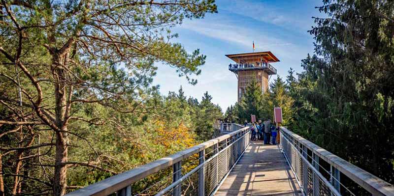 Nahe der französischen Grenze gibt es den ersten Baumwipfelweg Deutschlands mit Baumblibliothek und Dschungelbrücken. Zu entdecken gibt es viel, denn mit Naturwundern ist die Region um das Biosphärenhaus Pfälzerwald/Nordvogesen reich gesegnet. Wer es richtig abenteuerlich mag, kann in den Baumkronen übernachten und vielleicht an einer Fledermauswanderung teilnehmen. Hinauf führen zwei Wege: einer abenteuerlich, der andere sanft. Und runter geht es bequem über die Rampe oder rasant über die Baumrutsche.
