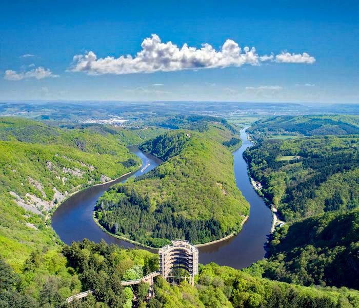 Eine unvergessliche Perspektive auf das Wahrzeichen des Saarlandes, die Saarschleife, könnt ihr vom Turm des Baumwipfelpfades Saarschleife im Kurort Orscholz erhaschen. Beim Aufstieg über die barrierefreie Rampe kommt ihr an Buchen, Eichen und Douglasien des Naturparks Saar-Hunsrück vorbei – mit all ihren Bewohnern. Sehenswert ist die Saarschleife auch vom Ufer aus. Wer allerdings aus 42 Meter Höhe einen Blick auf das Naturwunder erhaschen konnte, für den bleibt das Panorama wohl für immer unvergesslich.