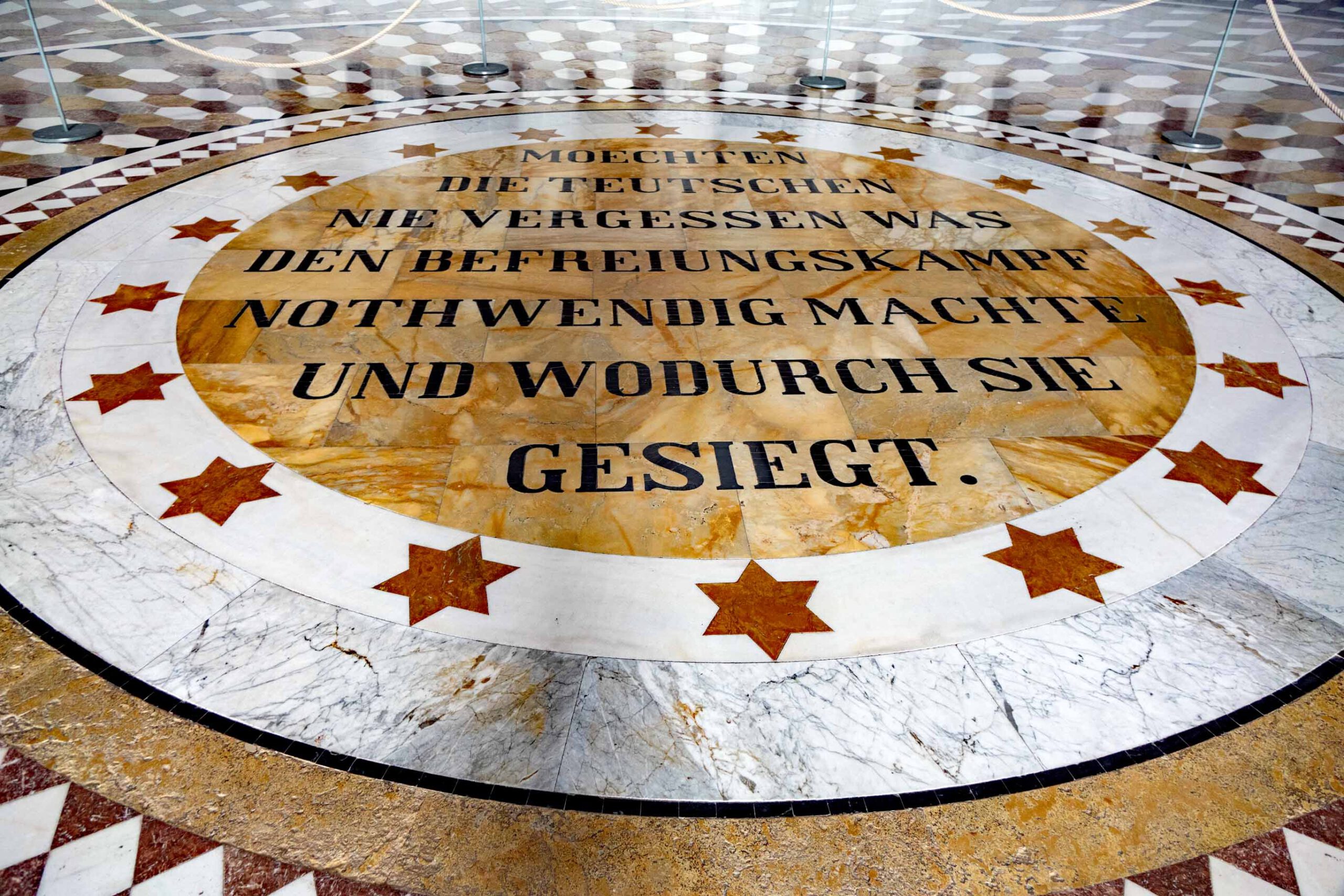Der Fußboden ist mit einem Mosaik aus weißem, rotem, grauem und braunem Marmor ausgelegt, in dessen Mitte auf gelbem Marmor aus Siena hervorgehoben eine Inschrift steht. Ringsum halten sich die 34 Siegesgöttingen, Viktorien genannt, an den Händen. Sie stehen für die 34 deutschen Staaten, die zu der Zeit der Erbauung der Halle existierten. Die Nischen hinter den Viktorien besteht aus Carrara-Marmor.