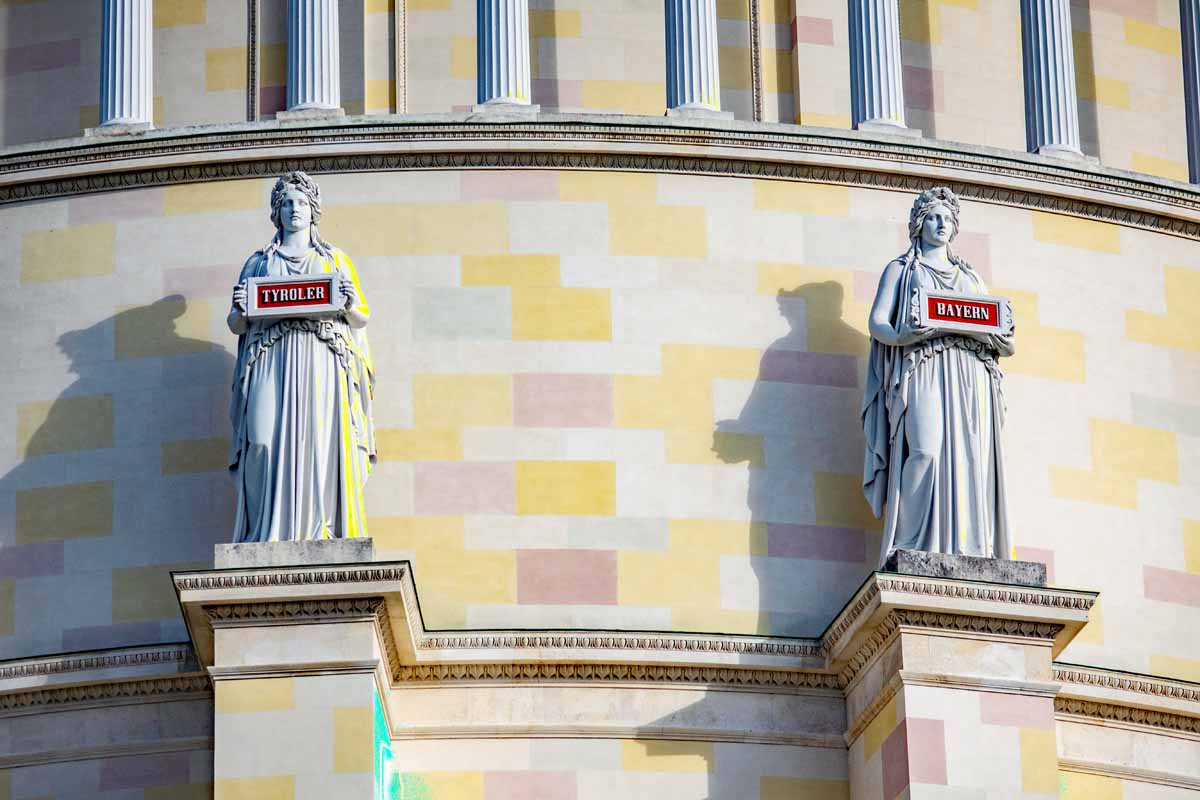 Diese Kolossalstatuen aus Kalkstein – im Übrigen über sechs Meter hoch – symbolisieren die 18 Volksstämme, die am Befreiungskrieg beteiligt waren. Einen Ehrenplatz links und rechts vom Eingangsportal ist den Österreichern und Preußen vorbehalten. Gleich neben den Österreichern steht auf der linken Seite des Eingangs die Statue, die Bayern repräsentiert.
