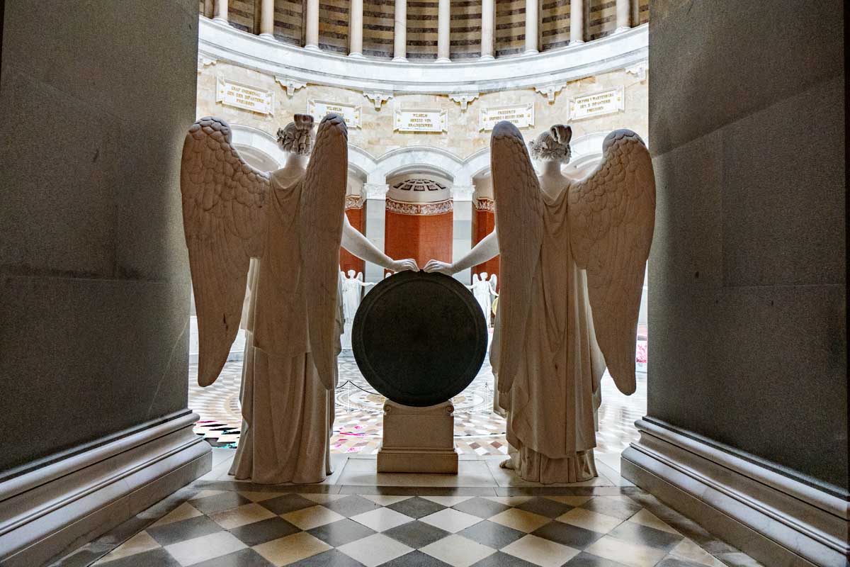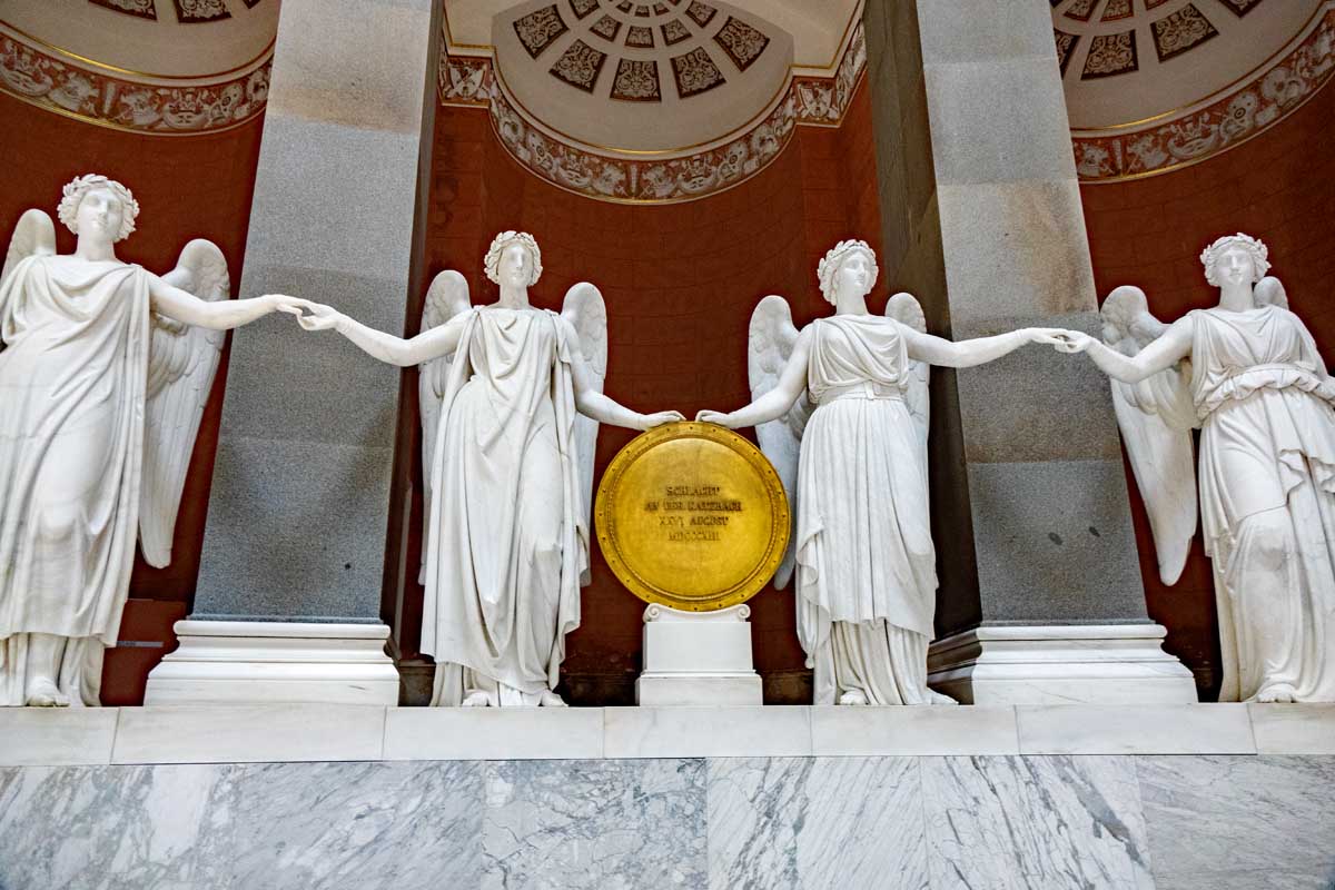 Insgesamt 34 Siegesgöttinnen reihen sich im Inneren der Halle aneinander und bilden einen Kreis entlang des säulengesäumten Ganges. Jeweils zwei der Göttinnen halten in ihren Händen Schilde aus gegossener Geschützbronze. Auf den jeweiligen Inschriften sin die siegreichen Kämpfe der Befreiungskriege von 1803 bis 1805 verzeichnet.