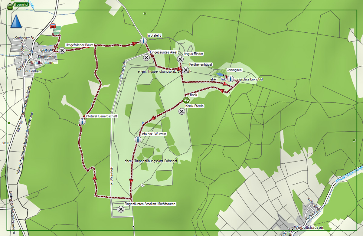 Parkplatz TSV Pfändhausen >>> Haardtwald >>> militärische Gebäude >>> Feldherrenhügel >>> Angus-Rinder >>> Jeisingsee >>> Konik-Pferde >>> militärische Bauten >>> Haardtwald >>> Parkplatz