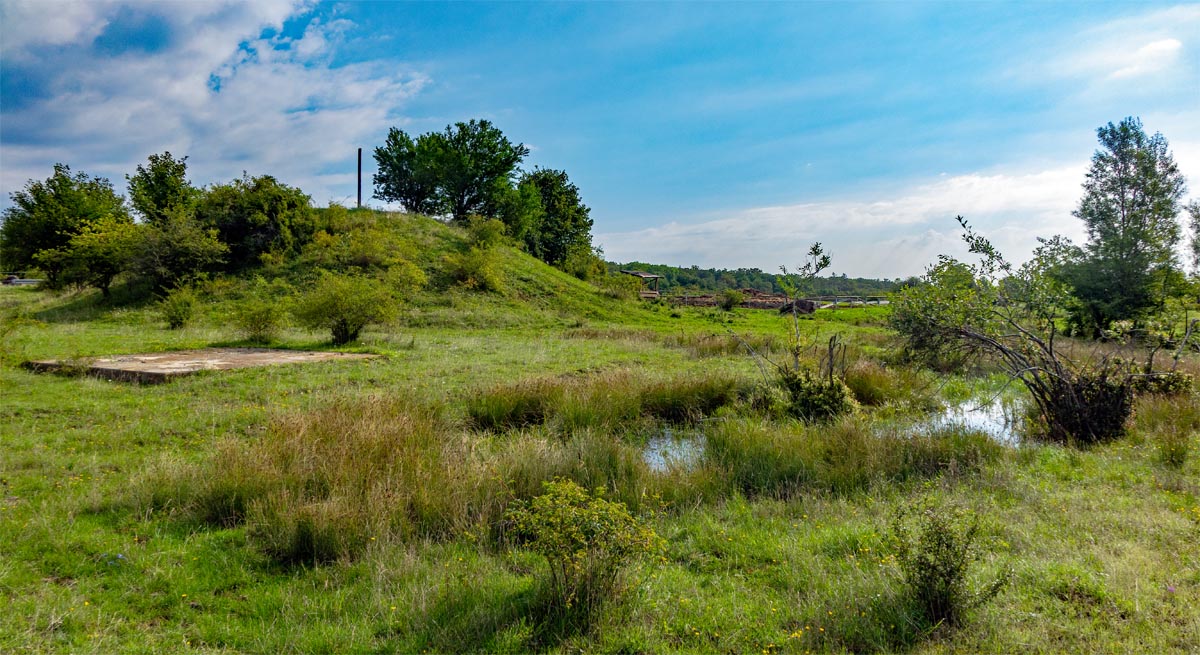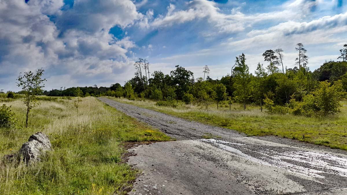 Einen weiteren Kilometer später – inzwischen hat sich die Landschaft in ein grasbewachsenes Feuchtgebiet verwandelt, liegt auf der rechten Seite ein eingezäuntes Areal mit ehemaligen Militärbauten. Vor dem Zaun biegen wir auf den schmalen Graspfad nach rechts ab, der etwas später in den Wald eintaucht. Etwa 850 m später halten wir uns an der T-Kreuzung rechts und nach 500 m an der Kreuzung links.