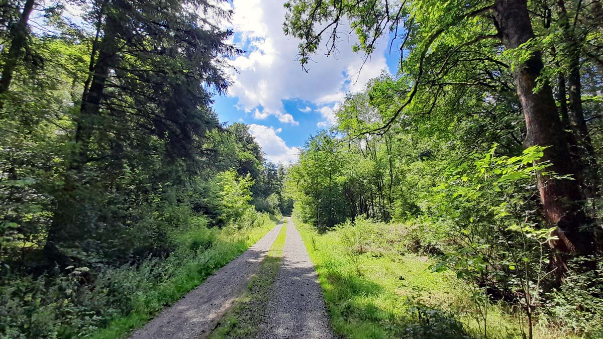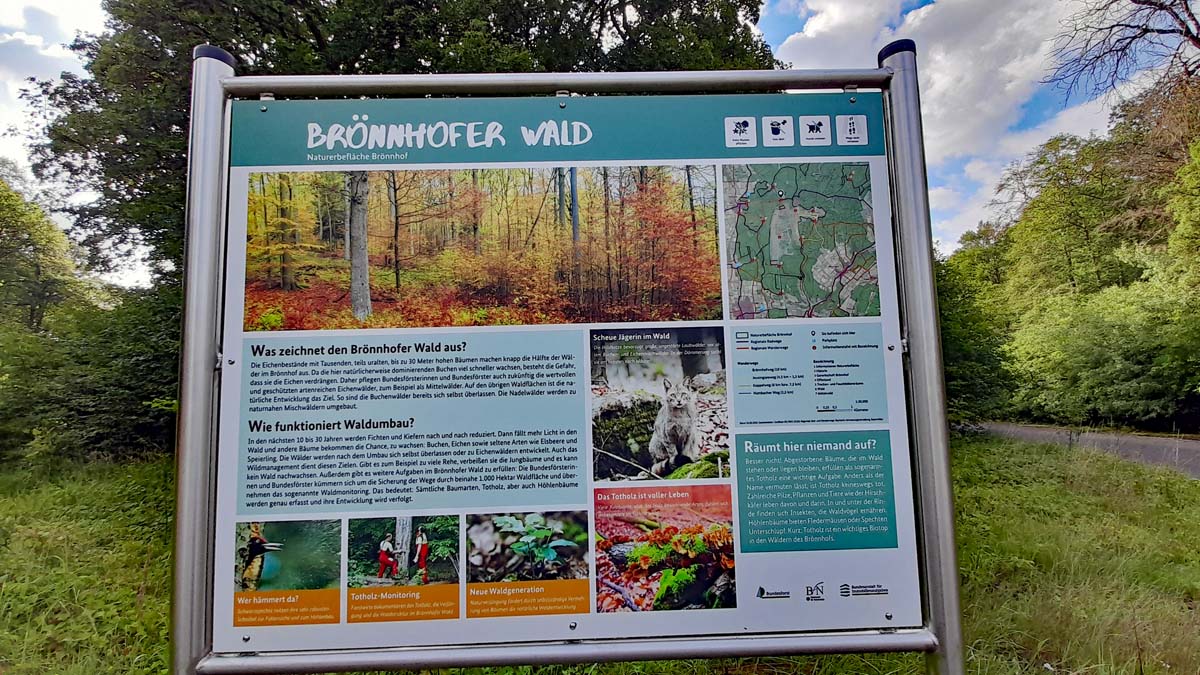 Dort, wo nach rechts die Straße Wolfsgrube abgeht, biegen wir nach links in den Wald. Hier befindet sich bereits eine Infotafel zum Brönnhof. Dem Hauptweg folgend (und den umgefallenen Baumstamm, der den Weg blockiert, umrundend) geht es durch den Wald bis zu einer Gabelung, an der wir uns links halten (fast geradeaus). Wir folgen dem Wegverlauf immer geradeaus bis zu einer Sternkreuzung, von der in alle Richtungen asphaltierte Straßen abzweigen.