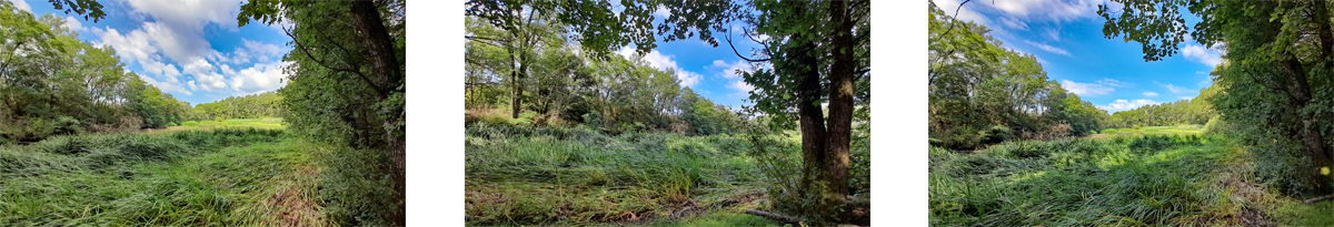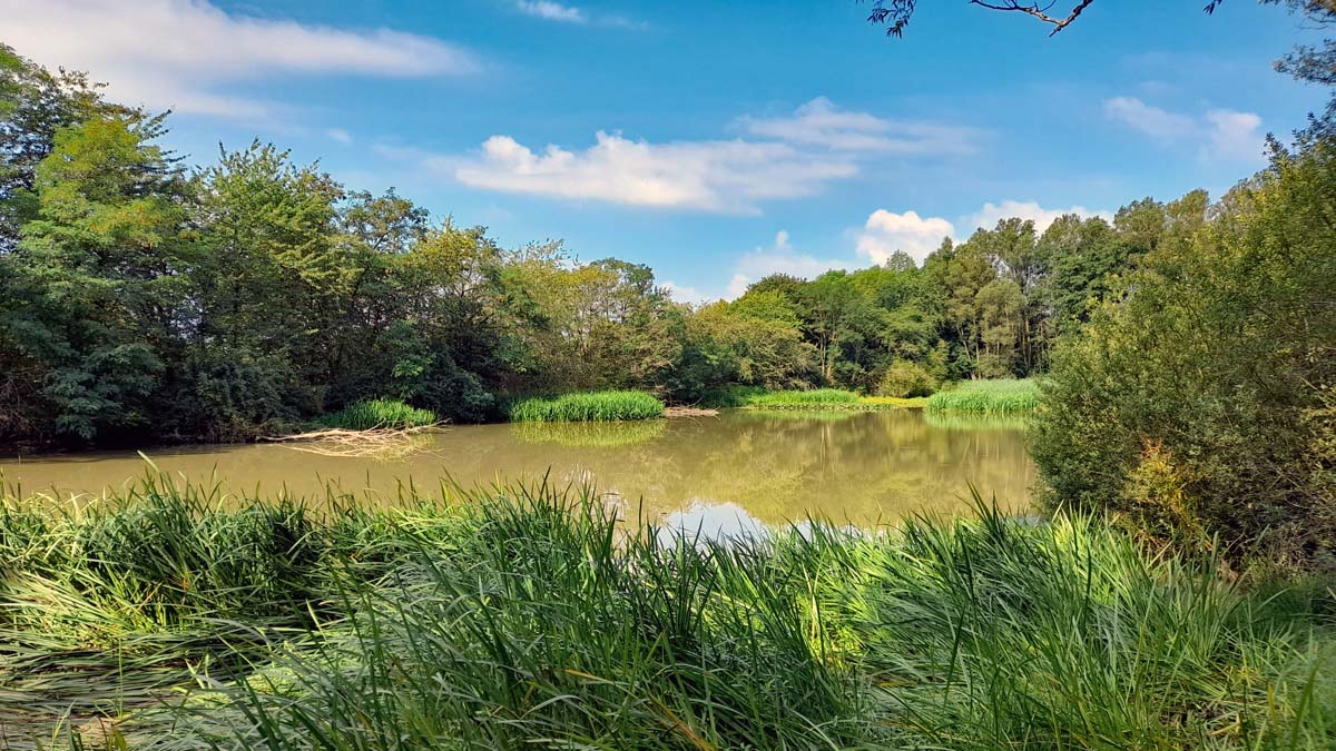 Über den nächsten Abzweig nach links machen wir einen Abstecher zum Jeusingsee. Um den See zu erreichen, biegen wir am Ende des Weges nach links ab und dann die nächste wieder links. Vor dem Waldstück, das den Teich umrahmt, biegen wir nach rechts ab und kommen über einen schmalen Weg gleich nach ein paar Metern links zum Ufer.