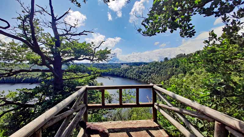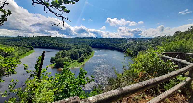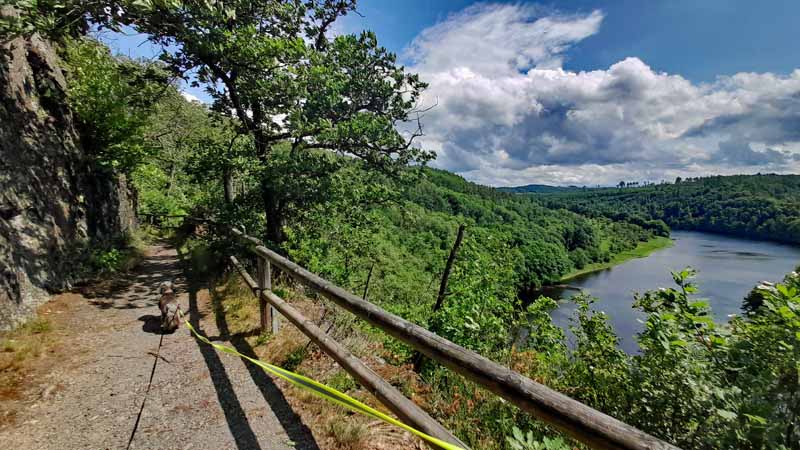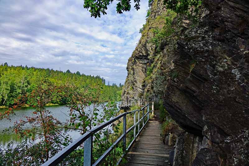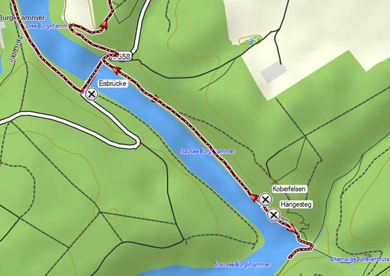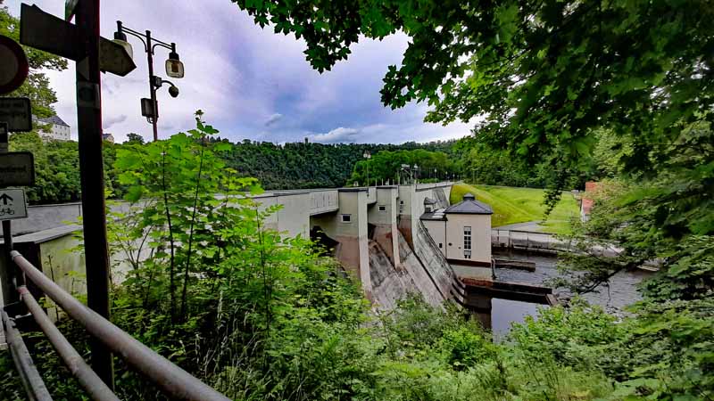 Auf der anderen Seite der Saale wenden wir uns bei dem Picknickplatz nach rechts und biegen bei nächster Gelegenheit auf den Pfad nach links in den Wald ab, der uns an eine T-Kreuzung bringt, an der wir nach links abbiegen. Nach knapp 200 m treffen wir auf die Staumauer der Burgkhammer-Talsperre.