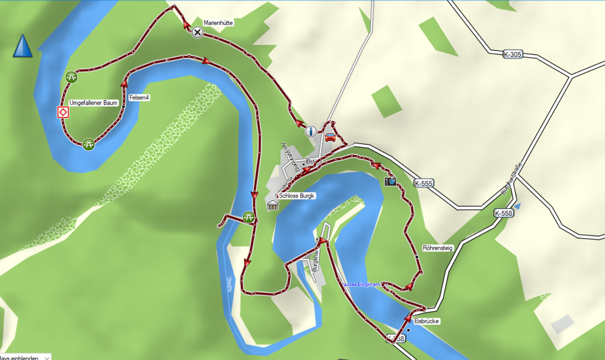 Wanderparkplatz >>> Marienhütte >>> Saaleschleife >>> Holzbrücke >>> Staumauer Burgkhammer >>> Eisbrücke >>> Streuobstwiese >>> Röhrensteig >>> Schloss Burgk >>> Saaleturm >>> Wanderparkplatz