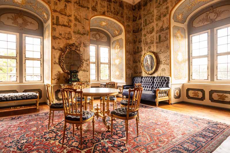 Ganz anders sieht es im Prunkzimmer aus, das in der mittleren Ebene eingerichtet und im barocken Stil mit allerlei verschnörkelten Ornamenten aufwartet. Herzstück in dem Schlafkabinett ist die mit einem verzierten Baldachin ausgestattete Schlafstätte. Sie konkurriert mit dem wunderschönen Gemälde an der Decke.