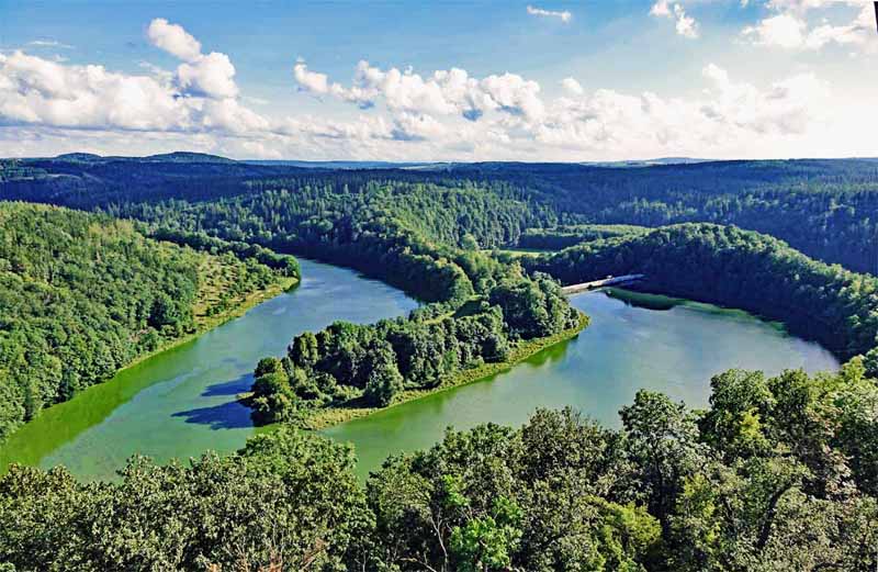 Wobei die einzelnen Stauseen mal Ober- und mal Unterbecken für die Pumpsteicherkraftwerke darstellen. Insgesamt hat der Burgkhammerstausee eine Fläche von rund 36 Hektar und damit ein Fassungsvermögen von fast sechs Millionen Kubikmetern Wasser. Im Vergleich mit dem Bleilochstausee mit über 200 Millionen Kubikmetern Wasser ein eher winziges Areal, aber es ist ja auch nur ein Ausgleichsbecken.