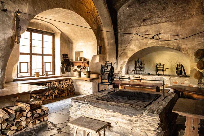 Dominiert wird die historische Schlossküche von einem überdimensionalen Kamin. Über 20 Meter ist er hoch und auch von außen gut zu erkennen. Beeindruckend ist er auf jeden Fall. Da kann man sich gleich vorstellen, wie hier für rauschende Feste vorbereitet und gekocht wurde.