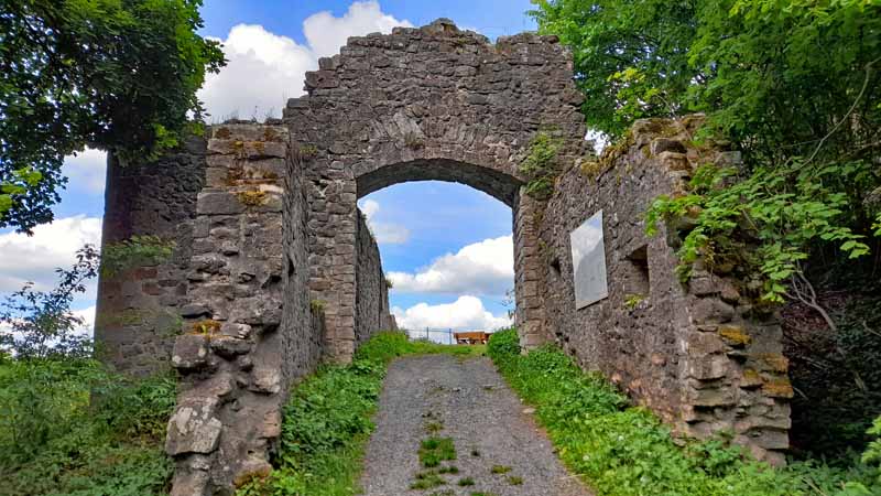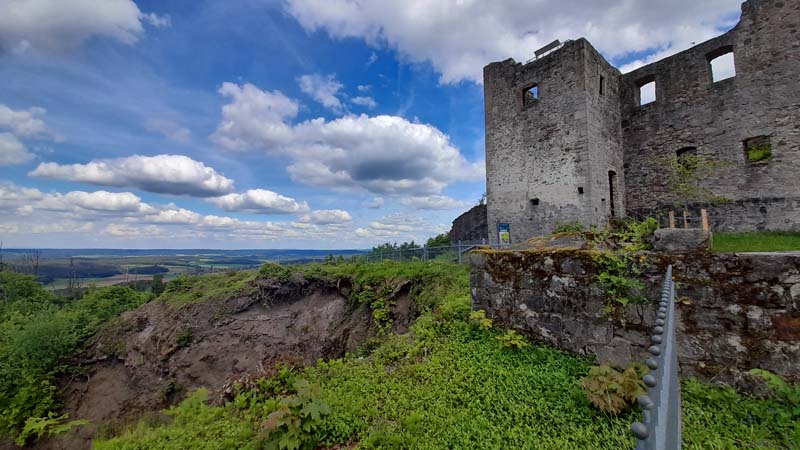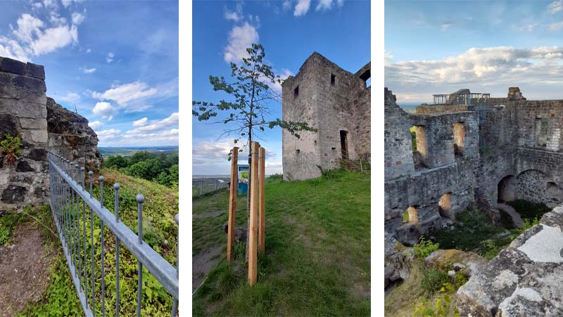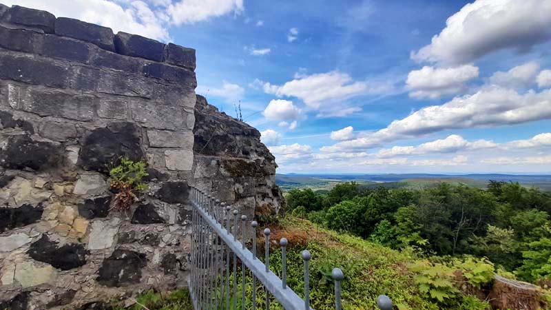 Kurz vor dem Gipfel treffen wir auf eine Infotafel zum aufgelassenen Basaltsteinbruch, der über einen kurzen Stichweg besichtigt werden kann. Im Anschluss wandern wir den Forstweg weiter, bis wir an dessen Ende auf die Ruine der Burg Bramberg treffen, die man ausgiebig erkunden kann.