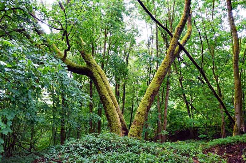 Anschließend gehen wir denselben Weg ein Stück zurück. Etwa nach halber Umrundung des Gipfels biegt nach rechts ein unscheinbarer Trampelpfad in den Wald (Beschilderung rote Burg). Wir folgen dem Pfad durch den Wald leicht bergab. Dieser macht nach einigen hundert Metern einen Linksknick und trifft dann weitere 200 m später auf eine Kreuzung, die wir geradeaus passieren.
