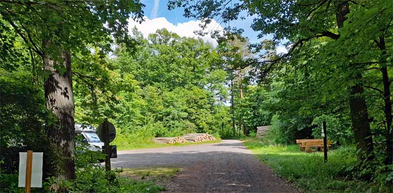 Gut 200 Meter weiter stoßen wir auf eine T-Kreuzung mit einem breiteren Weg. Hier biegen wir nach links ab und folgen gut 100 Meter später dem geschotterten Weg nach links (Markierung rote Burg) an einer Art Bauwagen vorbei (Förstereiwagen).