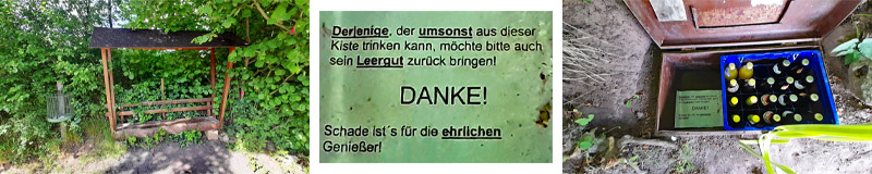 Dieser führt uns fast kerzengerade am Hang des Bramberges entlang zu einer T-Kreuzung am Waldrand. Wir biegen nach links ab und wandern weiter, bis wir auf der linken Seite an einer Kreuzung eine überdachte Bank in einem kleinen Gebüsch. Hier wartet eine kleine Überraschung: Wenn ihr in Richtung Bank schaut, ist rechts daneben unter den Sträuchern im Boden eine Kiste eingelassen, in der ihr gegen einen kleinen Obolus ein relativ kühles Getränk entnehmen könnt. (Bitte lasst die Pfandflasche dort!)