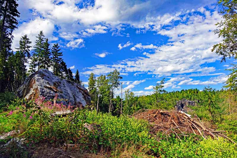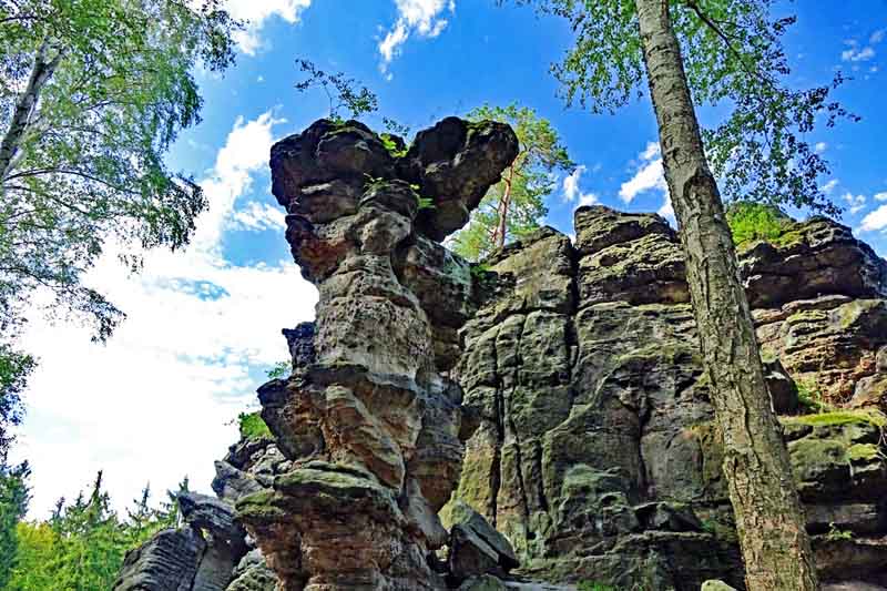Abseits der Touristenströme verläuft unsere Wanderung zu den Felsentürmen bei Rosenthal-Bielatal: die Herkulessäulen. Sie gelten als Wahrzeichen der Region. Zwischen der Schweizermühle und der Ottomühle liegen die beiden schlanken Felstürme Große und Kleine Herkulessäule mit ihren überhängenden Felsköpfen einträchtig im Wald.