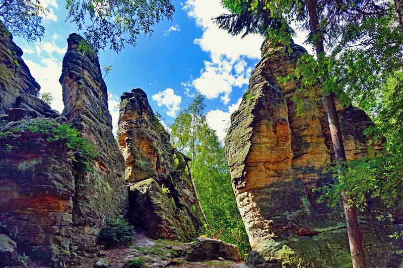 Felssäulen wie der Sachsenstein und die Kaiser-Wilhelm-Feste ragen aus dem Waldboden und balancieren Millionen Jahre alte Sandsteine in skurrilen Formen in schwindelerregender Höhe. Es scheint fast ein Wunder, dass sie noch nicht eingestürzt sind.
