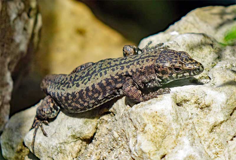 Kaum so attraktiv wie ihre farbigen Kollegen im Nachbarterrarium, ist die Mauereidechse in ihrer natürlichen Umgebung nur sehr schwer zu finden. Die hellbraune oder gräulich gefärbte Haut mit den vielen Flecken macht sie auf einem Baumstamm nahezu unsichtbar. Von Weitem ist sie nicht mal auf einem hellen Stein zu sehen, da sie wie ein Blatt oder ein Stück Rinde wirkt.