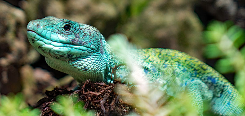 Mit ihrer leuchtenden Farbe ist die Smaragdeidechse schon von Weitem gut in ihrem Terrarium zu erkennen, wenn sie sich genüsslich auf den Steinen sonnt. In der Natur findet man sie in südlich exponierten Lagen an Waldrändern, Weinbergen und Bahndämmen. Sieht man etwas genauer hin, erkennt man, dass die Smaragdeidechse nicht durchgehend grün ist. Nach der Winterruhe wird die Kinn- und Kehlpartie leuchtend blau – teilweise auch bei weiblichen Tieren.