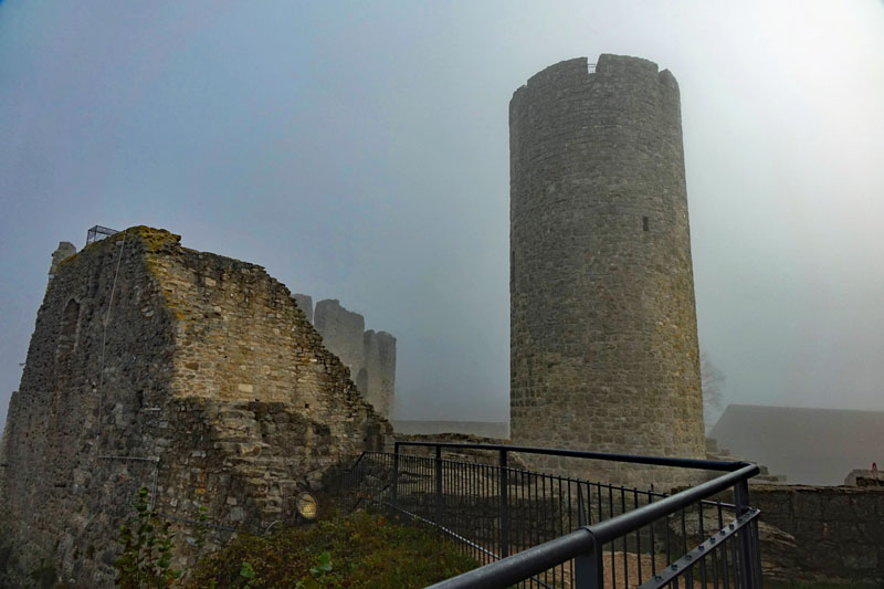 Die Sicht beträgt kaum über zehn Meter. Dann geht es hinter den vereinzelten Häusern und die Ecke. Und plötzlich, wie aus dem Nichts – und fast ein wenig unheimlich – wächst ein dreißig Meter hoher Steinturm aus dem verwaschenen Grau hier in der Oberpfalz, und rechts davon weist eine uralte Mauer in den Himmel – Burg Wolfstein.