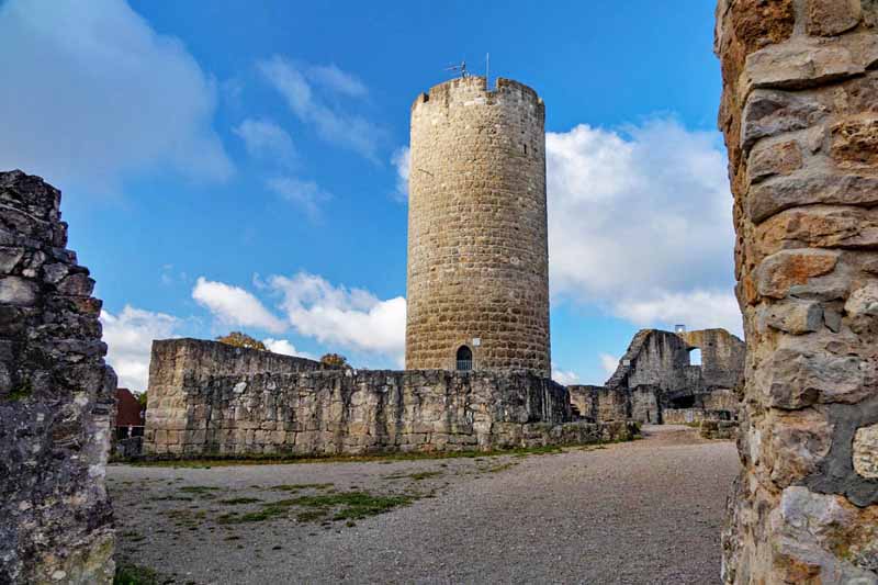 Höchstes und wohl auch ältestes Bauwerk in der Kernburg ist der Rundturm, der den Eingangsbereich flankiert. Dieser Bergfried stammt aus der Mitte des 13. Jahrhunderts und hat einen Durchmesser von fast zehn Metern. Sein damaliger Eingang lag auf beachtlichen elf Meter Höhe. Die Wachleute hatten von hier einen weiten Blick über das gesamte Umland – und natürlich auch ein perfektes Schussfeld.