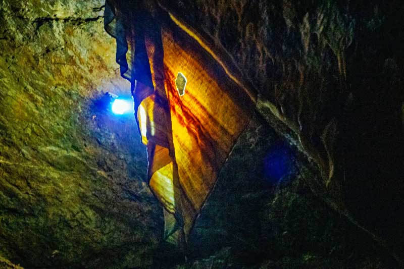 Zu den größten Sintervorhängen gehört die sogenannte Gardine. Das Loch in der Fahne aus Kalk stammt von einem Sowjetsoldaten, der mit einer Pistolenkugel durch das seltene Gebilde hindurchschoss.