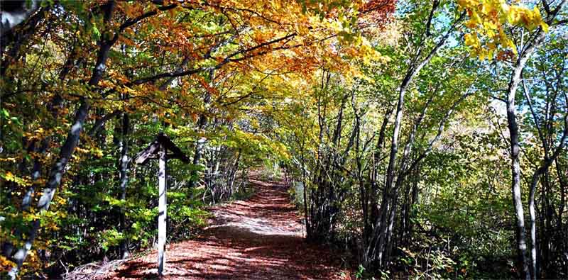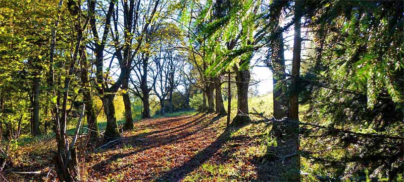Der Weg ist gut ausgeschildert. Im Großen und Ganzen geht es auf der Nordseite immer geradeaus. Langsam sinkt die Sonne etwas tiefer und wirft einen leichten Schatten auf die Baumwipfel.