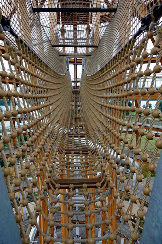 Ein Abenteuerspielplatz in schwindelnder Höhe für Jung und Alt also. An jeder Station findet ihr noch einmal genaue Infos, wie ihr diese überwinden sollt. Auf 28 Meter Höhe ist es möglich, über eine Zugangsrampe, eine klassische Hängebrücke oder Netzbrücke (mit freiem Blick nach unten) auf das mittlere Podest zu gelangen, auf dem sich der Eingang zur Rutsche befindet.