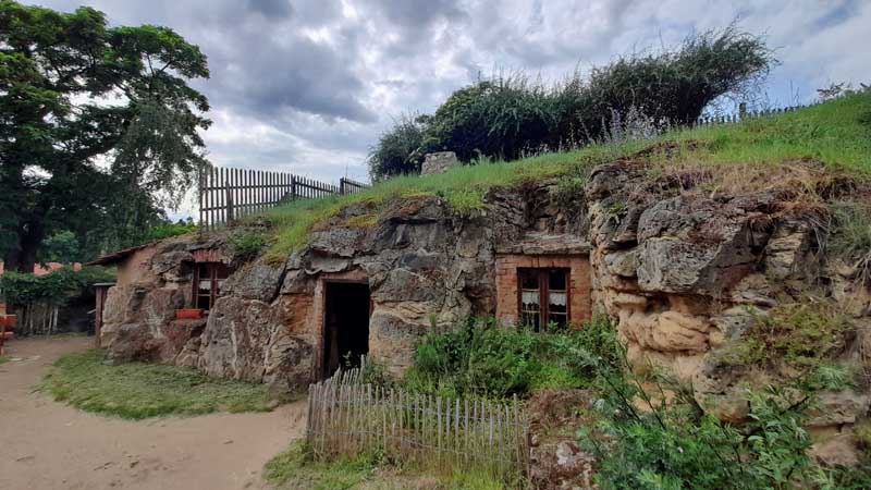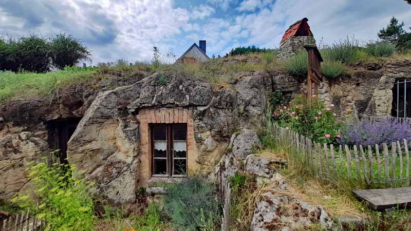 Und eben hier an einem Hohlweg an der ehemaligen Burganlage, von der heute kaum noch sichtbare Reste vorhanden sind, gibt es zwei weitere Höhlenwohnungen, die schon viel älter sind als die am Schäferberg und diesen als Vorbild gedient haben. Vom Hohlweg aus führen Treppenstufen in die höher gelegenen, Höhlen. Sie bestehen aus schlichten Schlafräumen, einer Vorratskammer und einem Wohnzimmer auf der Außenseite, an der sich Fenster befinden.