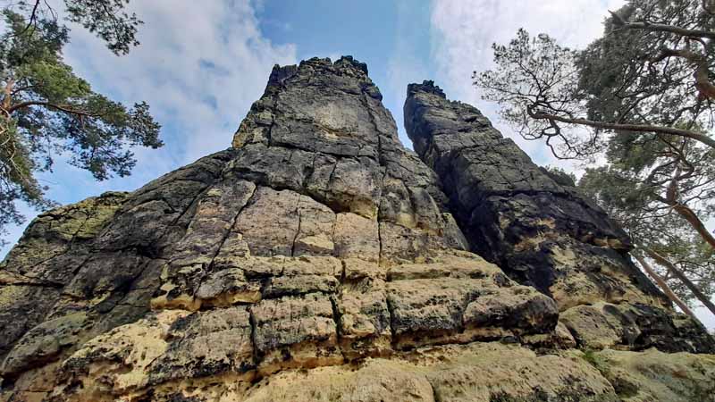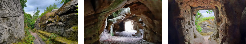 Der Waldweg führt uns an der Flanke der Zwieberge durch den Wald. An der T-Kreuzung biegen wir nach links ab und wandern auf den Hoppelstein. Weiter oben halten wir uns rechts und gehen dann immer geradeaus weiter am Steintisch vorbei bis auf die westliche Seite des Berges. Am Ende wird dieser zu einem Hohlweg, der in den Sandstein geschlagen wurde. Auf der linken Seite führen Stufen in eine verlassene Höhle. Gleich dahinter befindet sich eine als Museum ausgestattete Wohnhöhle mit schönem Aussichtspunkt gegenüber.