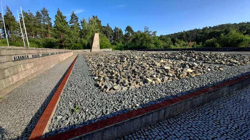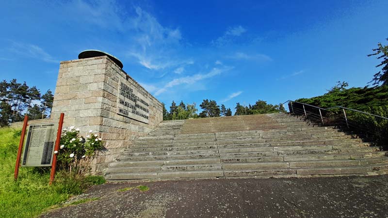 Von hier aus gehen wir zur Straße zurück und überqueren sie geradeaus. Schon an der Kreuzung treffen wir auf erste Hinweise auf das ehemalige KZ Langenstein-Zwieberge. Wir folgen dem breiten Weg bis zum Mahnmal, gehen die Stufen hinauf und auf der gegenüberliegenden Seite rechts neben dem Obelisken wieder hinaus. Wenn wir uns nun rechts halten, treffen wir wieder auf den Hauptweg.