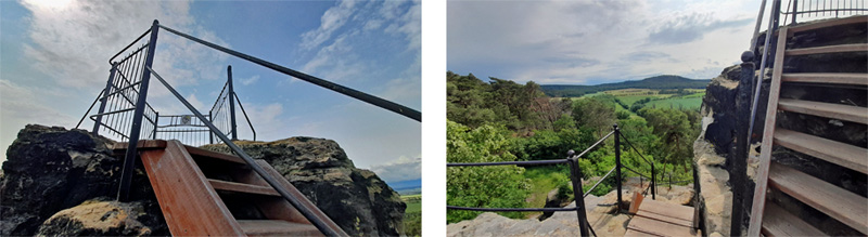 Am Ende des Feldweges liegen schräg rechts die Ruinen eines alten Anwesens. Wir gehen links und dann gleich auf den schmalen Fußpfad nach rechts in den Wald. Dort führen und provisorische Treppenstufen den Hang empor direkt zum Felsmassiv Gläserner Mönch, auf dem eine Aussichtsplattform liegt. Vom ursprünglichen Weg aus (Aufstieg über die Treppen) biegen wir am Felsen nach rechts ab und wandern ab hier auf dem Forstweg knapp unterhalb des Gipfelgrats immer geradeaus.