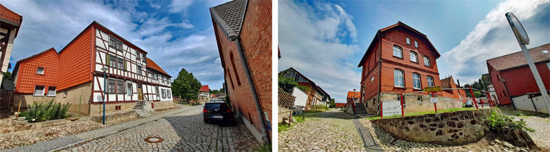 Nach der Besichtigung gehen wir die Straße Schäferberg weiter geradeaus und halten uns an der Friedhofstraße rechts, um im Anschluss nach links in die Quedlinburger Straße zu biegen. Am Ortsrand biegen wir hinter der Scheune auf der linken Seite in den nächste Feldweg nach links und biegen an der zweiten Abzweigung nach rechts ab.
