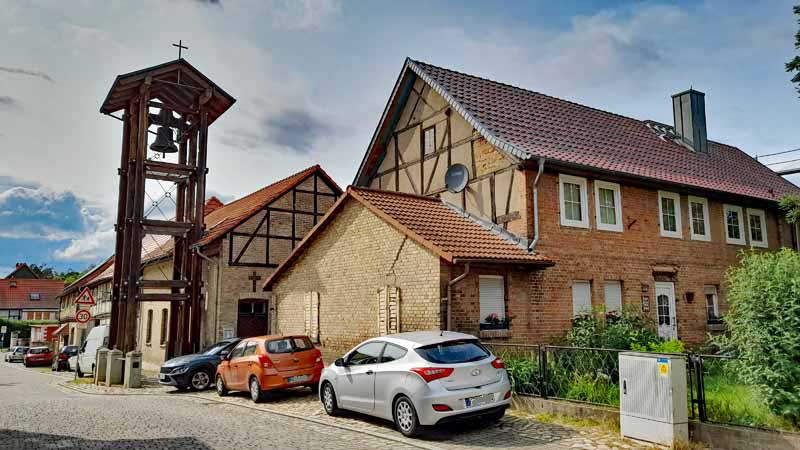 Auf der Dorfstraße reckt sich ein seltsam anmutender Kirchturm aus Holz mit Glocke in die Höhe und schmiegt sich dabei an einen Backsteinbau mit Fachwerkgiebel an. Wer sich wundert, was das ist, hier die Geschichte: