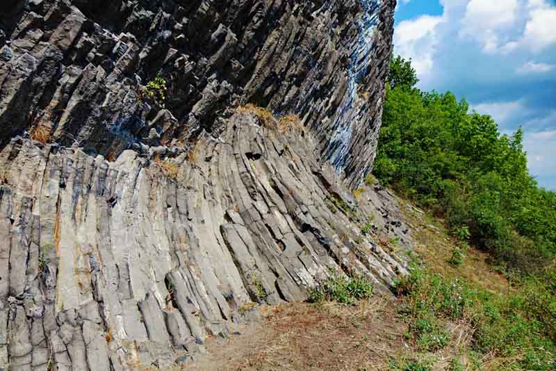 Damals lag die Erdoberfläche an dieser Stelle deutlich höher als heute. Leicht verwitterbare Materialien wie Ton und Sand auf dem Gipfel sind im Laufe von Jahrtausenden oder gar Jahrmillionen durch Erosion abgetragen worden. Zurück geblieben ist das harte, kaum verwitterbare Material, der Basalt. Und weil das flüssige Magma in dem Schlot relativ langsam abgekühlt ist, haben sich meterlange, fünf- oder sechseckige Basaltsäulen gebildet, die früher einmal senkrecht zur Abkühlungsfläche standen.
