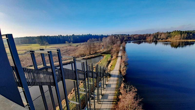 Ihr könnt den herrlichen Ausblick von der Himmelsleiter aus bewundern, deren Aussichtsplattform sich rund 30 Meter über die Teiche zu ihren Füßen erhebt. Konstruiert von einem Architekturbüro in Tirschenreuth ist die Plattform der Himmelsleiter über zwei gigantische Treppen auf schlanken Stahlstützen erreichbar.