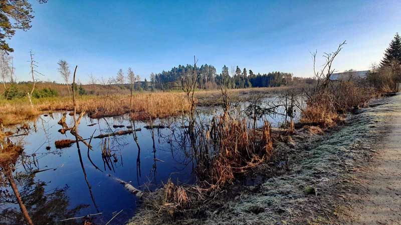 Die Tirschenreuther Teichpfanne ist ein wunderbares Ausflugsziel, egal, ob ihr zu Fuß oder mit dem Fahrrad unterwegs seid. Mehr von der Natur seht ihr sicherlich, wenn es etwas langsamer vorwärts geht. Wir waren im Juni hier, als die Teichfrösche gerade Laichzeit hatten und überall ein wundersames Konzert veranstaltet haben. Und dann noch mal im Winter. Vergesst im Sommer nicht, euch gründlich mit Mückenspray einzunebeln, vor allem, wenn ihr abends unterwegs seid. Leider waren die im Navigationsgerät eingezeichneten Wege, die für eine Rundwanderung angedacht waren, nicht mehr vorhanden oder überflutet, sodass wir den gleichen Weg wieder zurück gegangen sind. Wie weit ihr lauft, ist euch überlassen. Zurückzufinden, ist nicht schwer.