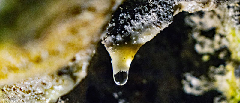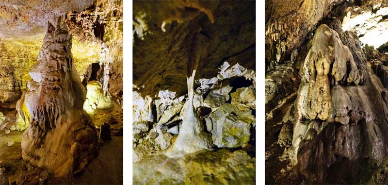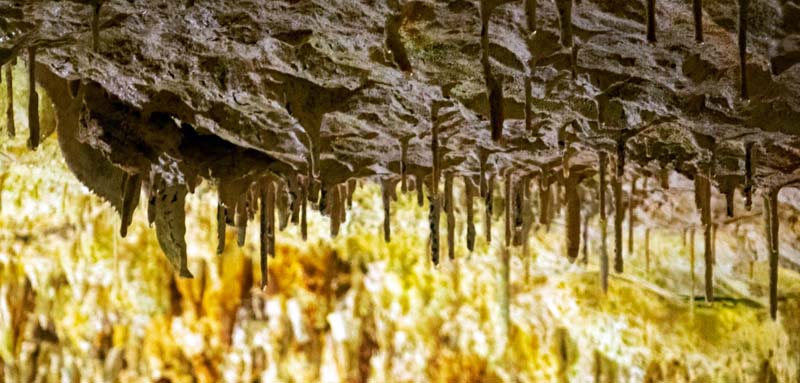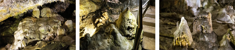 Weiter geht es an einem großen Stalagmiten vorbei in die Niederwaldgrotte, in der sich große Besucher vorsehen müssen, nicht mit dem Kopf anzustoßen, weil sie so niedrig ist. Aus der Decke wachsen feinste Sinterröhrchen, die innen hohl sind. Durch diese Röhre tropft Wasser auf die darunterliegenden Stalagmiten.