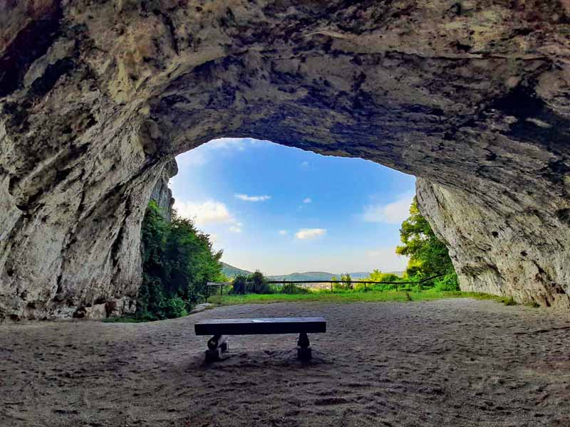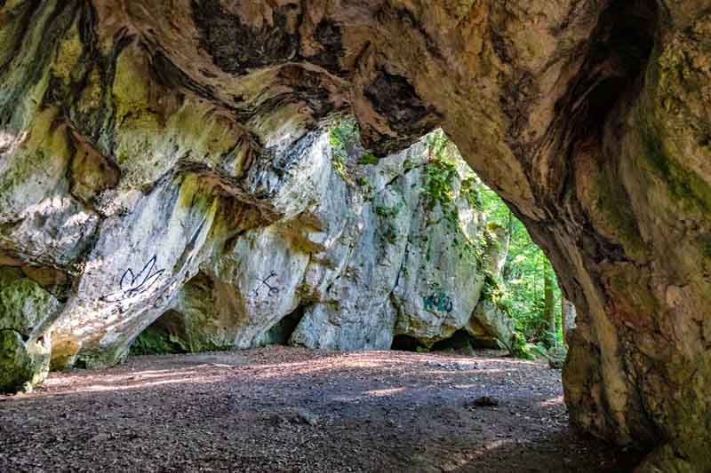 Das Hohlloch bei St. Wolfgang beeidruckt durch seinen riesigen, domähnlichen Eingang. Vom Wanderpfad aus sieht man die Höhle nicht, denn der Hohllochberg ist an allen Seiten mit einem wunderschönen Mischwald überzogen. Um den Kraftort hautnah zu erleben, muss man über einen steilen, geschotterten Weg hinaufsteigen. Beim Aufstieg kommt ihr an weiteren kleineren Höhlen auf der linken Seite vorbei, zu denen sich ebenfalls ein kleiner Abstecher lohnt.