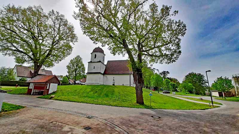 Gut ausgestattet geht es dann endlich an der Ampel links auf der Petersgmünder Straße, die erwartungsgemäß in den gleichnamigen Ortsteil führt. Und gleich fällt unser Blick auf eines der ältesten Gebäude im Ort, das sich etwas hinter den angrenzenden Häusern versteckt.