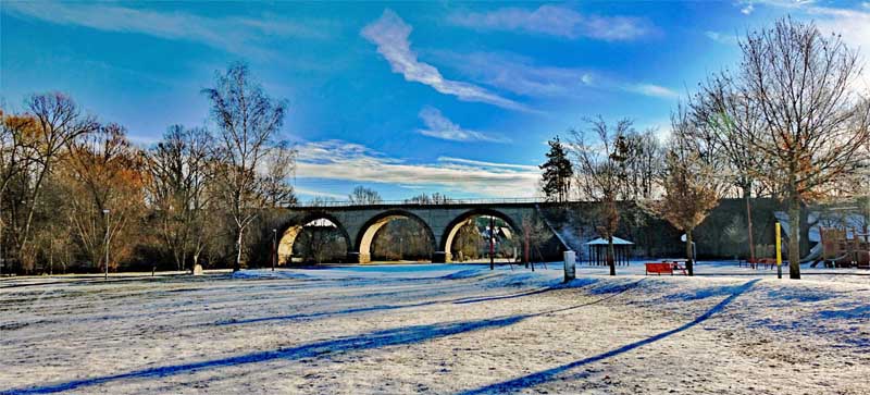 Als wir aus dem Auto auf dem Parkplatz am Bruckespan in Georgensgmünd aussteigen, hat es knackige -8 Grad. Der Himmel hier im Landkreis Roth ist stahlblau und die Sonne scheint nach tagelangem Regen und Schnee das erste Mal wieder freudig auf unsere Gesichter. Gleich vom Parkplatz aus haben wir einen wunderbaren Blick auf das Eisenbahnviadukt. Und hätten wir uns nicht schon unsere Route ausgewählt, wäre der Planetenweg entlang der ehemaligen Bahntrasse nach Spalt sicherlich eine gute Alternative.