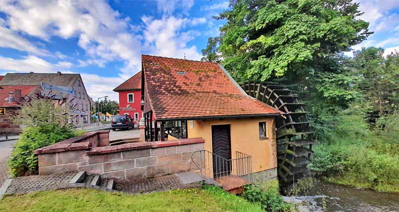 Direkt gegenüber des Parkplatzes liegt das Wahrzeichen Georgensgmünds: das historische Wasserrad. Erbaut um 1910 wurde das Wasserrad in den 1980er Jahren an die Gemeinde übergeben. Anlässlich des ersten Wasserradfestes ließ man die inzwischen in die Jahre gekommene Konstruktion restaurieren und an die Stelle im Ortskern stellen, an der sich früher eine alte Papiermühle befand. An der Stelle, an der das Wasserradhäuschen früher stand, errichtete man eines der ersten Elektrizitätswerke. Damals gehörte Georgensgmünd noch zum Landkreis Schwabach.