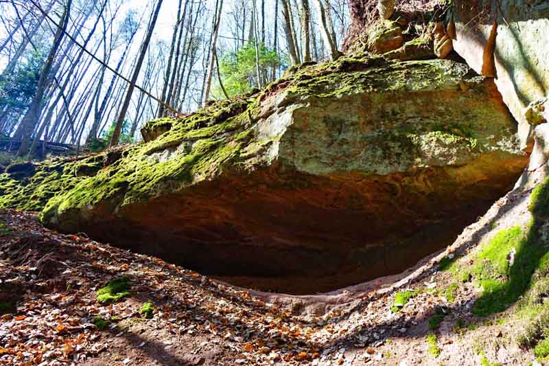 Nur etwa 30 Kilometer südlich von Nürnberg liegt das Spalter Hügelland. Bekannt ist es vor allem für seinen Hopfenanbau und die zahlreichen Brauereien. Was aber kaum jemand weiß, ist, dass es hier im Fränkischen Seenland auch viele sehenswerte Schluchten gibt, die kleine Bäche in den Burgsandstein gegraben haben. Eine davon ist die wilde Massendorfer Schlucht. Ein etwa fünf Kilometer langer Rundweg führt direkt an der Massendorfer Schlucht vorbei. Ein paar steile Stufen führen hinab in das einzigartige Biotop.