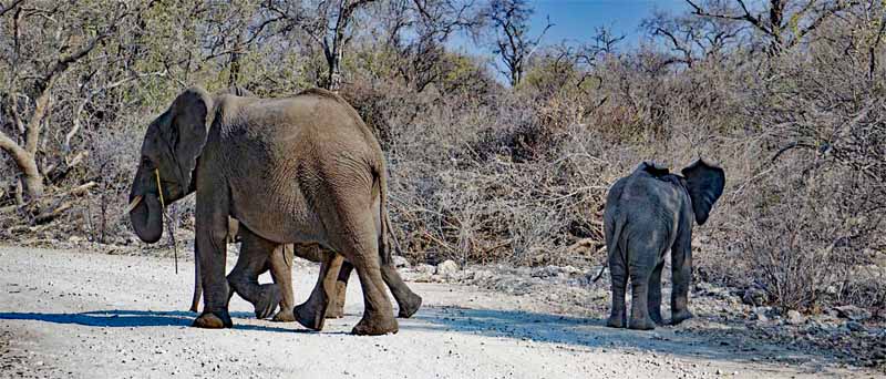 Streifen rechts ein paar Tiere durchs Unterholz, kann es sein, dass sich weitere Mitglieder der Familie auf der linken Straßenseite aufhalten. Das Eindringen in eine Gruppe Elefanten mit ihrem Nachwuchs – ob gewollt oder versehentlich – wird immer als Angriff von den Tieren ausgelegt und hat seinerseits einen Angriff der Elefantenmütter zur Folge. Dabei ist es ihnen völlig egal, ob es sich um einen Löwen oder auch ein Auto handelt. Sie am besten frühzeitig zu, dass du dich vorsichtig rückwärts aus der Gruppe herausbewegst, bevor es zu einer brenzligen Situation kommt.