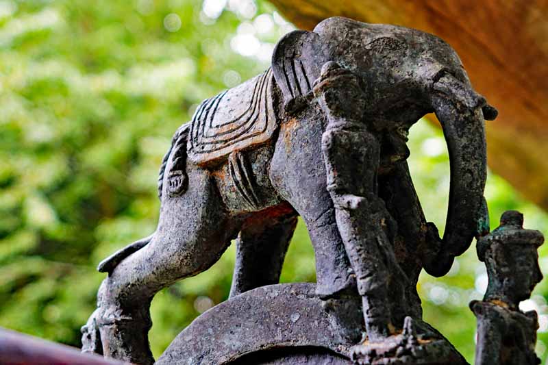 Auf dem Weg zum Tempel kommt ihr an einem kleinen Wildbach und einem großen Glockenspiel aus Myanmar vorbei. Rechts auf dem schmalen Rundweg zwischen Elfenblumen, Orchideen und anderen seltenen Schattenstauden befindet sich die Statue der Schlangengöttin.