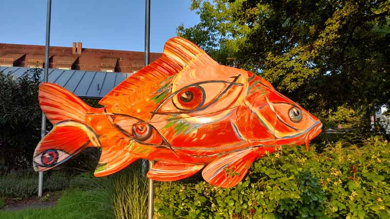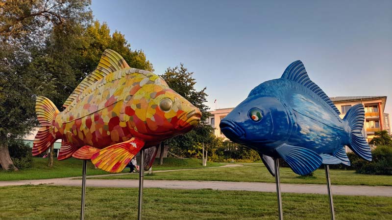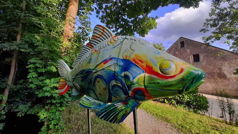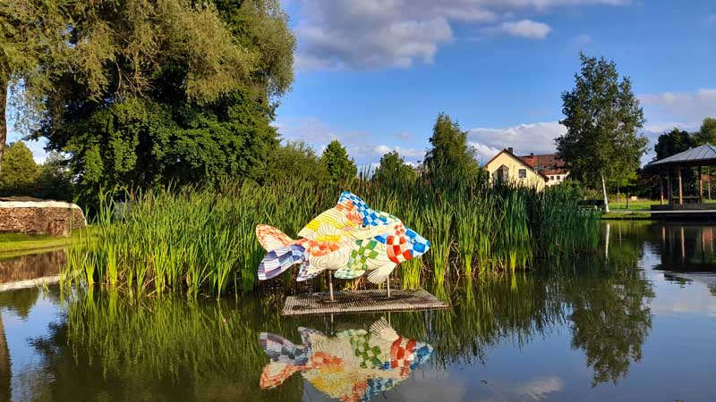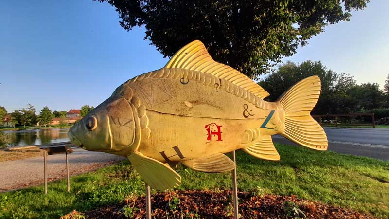 Die 20 riesigen Karpfenskulpturen sind alle von einheimischen Künstlern bemalt und jedes für sich ein wunderschönes Unikat. Jeder einzelne von ihnen steht an einem ausgesuchten Platz, an dem es etwas Außergewöhnliches zu berichten gibt.