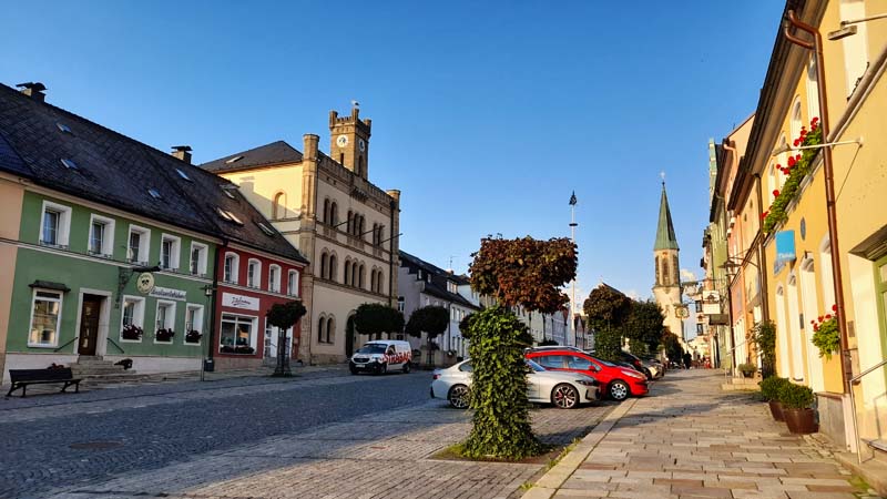 Etwa in der Mitte des weiten Straßenmarktes liegt das ehemalige Rathaus. Der dreigeschossige Bau sticht schon bei flüchtiger Betrachtung aus der Häuserreihe heraus. Wie eine trutzige zinnenbekrönte Burg im Würfelformat trägt es einen Uhrenturmaufsatz.