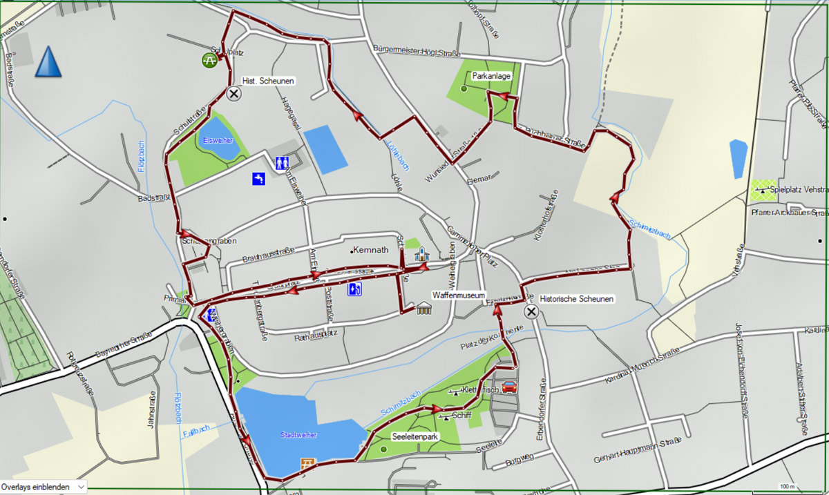 Parkplatz >>> histor. Scheunen (Am Langen Steg) >>> Wiesengrund >>> Falkensteinpark >>> Mühlbach >>> histor. Scheunen (Schulstraße) >>> Eisweiher >>> Stadtplatz Kemnath >>> Cammerloher Platz >>> Stadtweiher >>> Seeleitenpark >>> Parkplatz