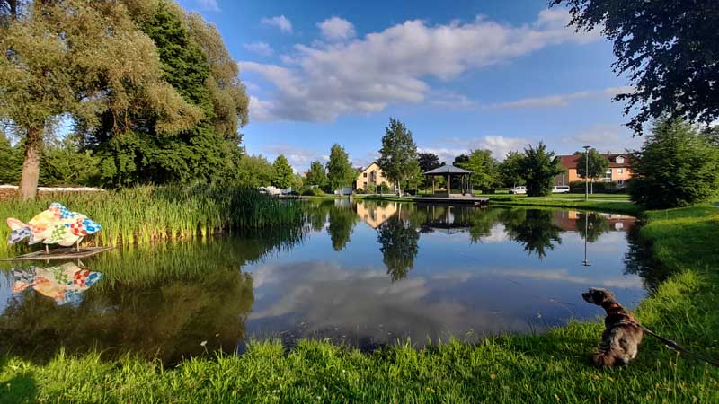Ringsum weitläufige Wiesen mit altem Baumbestand. An der einen Seite lockt der Stadtweiher mit jeder Menge Wasser und einer Seebühne, auf der im Sommer Konzerte stattfinden. Gespeist wird der Stadtweiher vom Schirnitzbach, der den Weiher nicht nur mit frischem Wasser versorgt, sondern auch mit Raubfischen wie Hechten und Forellen. Trotz der Raubfische können auch Karpfen und Schleien perfekt gedeihen, denn sie können sich anscheinend gut durchsetzen.